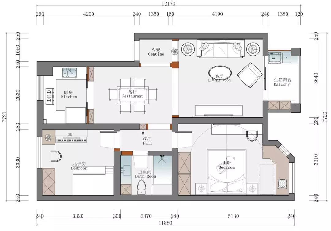 本案為86方三室兩廳設計,業主要求盡量簡約溫馨,注重環保和性價比,色系上主要用的是冷暖拼色和金屬色。