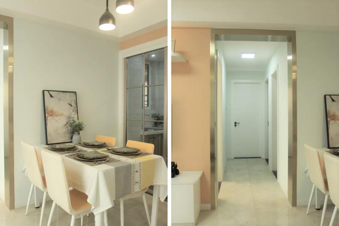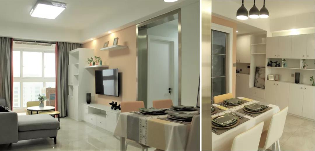 在戶型上,由于是剛需,布局方面并未做過多改動,主要是新增了儲物系統,做了衣柜、衛生間臺盆、酒柜和飄窗柜,使居室實用與美觀兼備。