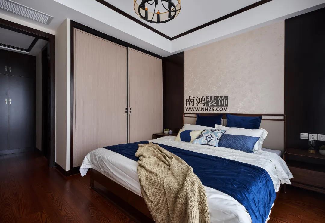 主臥背景選用亞麻色的印花墻紙,亞麻色比白色溫暖,比黃色低調,搭配任何顏色都不會突兀。床品點綴深藍,鮮活視覺。