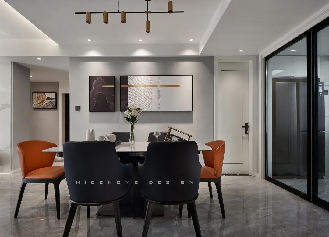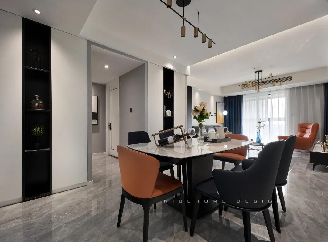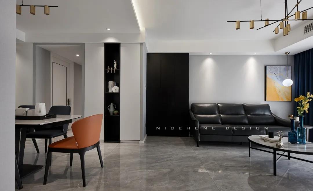 地址 / 楊公佳苑 戶型 / 三室兩廳 面積 / 110㎡ 風格 / 現代簡約 設計施工 / 浙江南鴻裝飾 裝飾亮點 ? 本案整體設計以沉穩時尚的黑白灰質感為出發點,擯棄一切復雜的外在形式,回歸到生活的本質。 戶型圖 ? 01. 客廳 LIVING ROOM 黑白灰為主色打造的簡約居家環境,通過窗簾、掛畫與單人沙發等軟裝元素進行色彩點綴,看似簡單隨意,層次性卻一點不差。 家具雖陳設簡單,在材質與顏色上都做到了巧妙呼應。 沙發旁打造一組黑色柜體,增加儲物設計。空間內的黑白灰色塊得到有機統一,顯出高級質感。 02. 餐廳 DINING ROOM 餐廳恰好處于過道口,好比一個交通樞紐,將家中多個空間聯結在一起,相鄰的距離也讓客廳的簡約氛圍得到了延展。 現代風六人位家庭餐桌,干凈的桌面顏色,搭配柔和的餐椅線條,看起來十分時尚。過道口兩側嵌入黑白色柜體,作為實用而美觀的一面背景。 簡約又帶有藝術感的掛畫,是整體氛圍的萃取凝結。 △餐廳望向過道的視角 03. 廚房 KITCHEN 廚房櫥柜以上淺下深的配色,營造視覺層次感,無把手設計更顯利落。 04. 臥室 BEDROOM 臥室以精簡的布置,搭建秩序理性的氛圍場域,黑白灰過渡而來的休憩空間顯得尤為沉靜。 背景墻采用拼接感紋理墻布裝飾,素雅別致,兩側是壁燈與吊燈的不對稱組合,以這種非對稱的形式成功打破空間序列感。 陽臺包進做書房使用,結合開放式書架,休閑、美觀與收納屬性兼備。 05. 陽臺 BALCONY 生活陽臺,定制洗衣柜將洗衣機納入,吊柜用來收納生活用品與雜物。 06. 衛生間 BATHROOM 衛生間鋪貼大理石紋理的瓷磚,白色讓視覺十分明朗干凈,又有著擴容的效果。