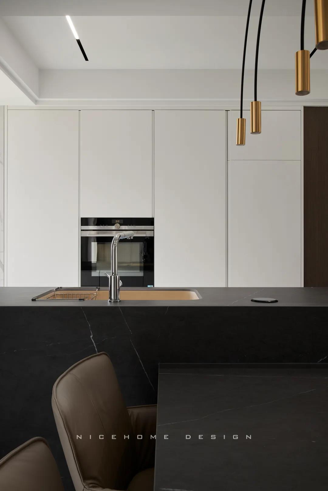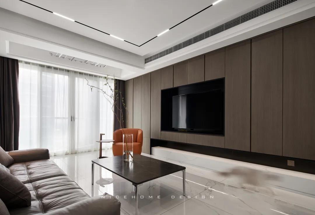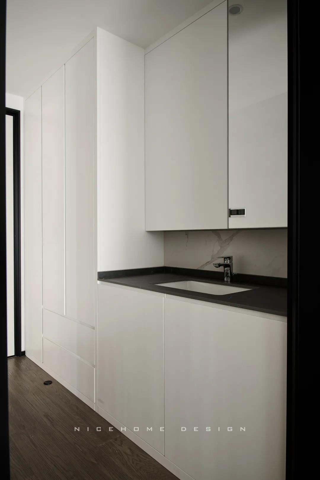 Quiet Time 本案以現代簡約風格為主旨,潔凈的配色、高級感的家具材質,以及巧妙的空間序列規劃,再加上通透寬敞的開放式布局,令整體空間在理性的架構中傳達著現代主義的美學觀感。 ? 案例信息 地址:天鴻君邑 戶型:兩室兩廳 面積:145㎡ 風格:現代簡約 設計施工:浙江南鴻裝飾 ? 戶型分析 屋子是超高層建筑,一方面承重結構比較多,能動的墻體有限,另一方面采光通風非常好。 主要是把原來的入戶花園改為了廚房,這樣原來的廚房就可以作為西廚和餐廳的一部分,解決了功能上的需求也讓餐廚區更寬敞。 走廊型玄關,與內里的過道無縫銜接,加上燈線的拉伸,視覺延展性極強。左手墻面留白,右手邊做深木色的收納柜提供合適的收納空間。 空間遵循現代簡約的架構模式,主色調由明凈的白和溫潤的木組成,淡然含蓄,幾根萌發綠意的小枝椏點綴出自然空靈的氣息。 電視背景墻做整面的柜體,地臺取代電視柜的位置,與上方柜體拉開一定距離,削減了一定厚重感。茶幾臺面選擇巖板材質,四四方方的造型含規整有序之意。 局部放置一把橙色單椅,讓視覺更富有生機,搭配置物小邊幾,閑暇時光的閱讀、喝茶也有了好去處。 屋子采光極好,開放式格局進一步放大優點,光線灑入空間,成為天然的柔光濾鏡。明朗有序的線條,搭建起主人向往的現代品質生活。 餐廚空間進行重新規劃后,餐廳與西廚合為一體,兩側白色高柜充分利用空間,把收納效率提到極致,極簡銑槽柜門無把手,讓視覺保持統一干凈。 一體成型的黑色巖板餐桌結合西廚島臺,塑造空間純粹內斂的高級質感,清冷有型之中悄然散發出精致韻味。 步入主臥,過道一側將衛生間干區與收納柜結合,類似酒店式的布局,干凈清爽。操作臺面周圍做擋水條,可以很好地防止濺水。 主臥內部利用陽臺拓展使用空間與視覺深度,同時讓更多的自然光線進入房間。背景墻留白,絳紫色絨布床頭詮釋著優雅,陽臺處擺放主人的健身器械方便早起運動。 衣庫位于主臥與次臥中間做統一收納,柜門使用長虹玻璃隔斷,結合柜內燈光所呈現的若隱若現的朦朧感,超絕!