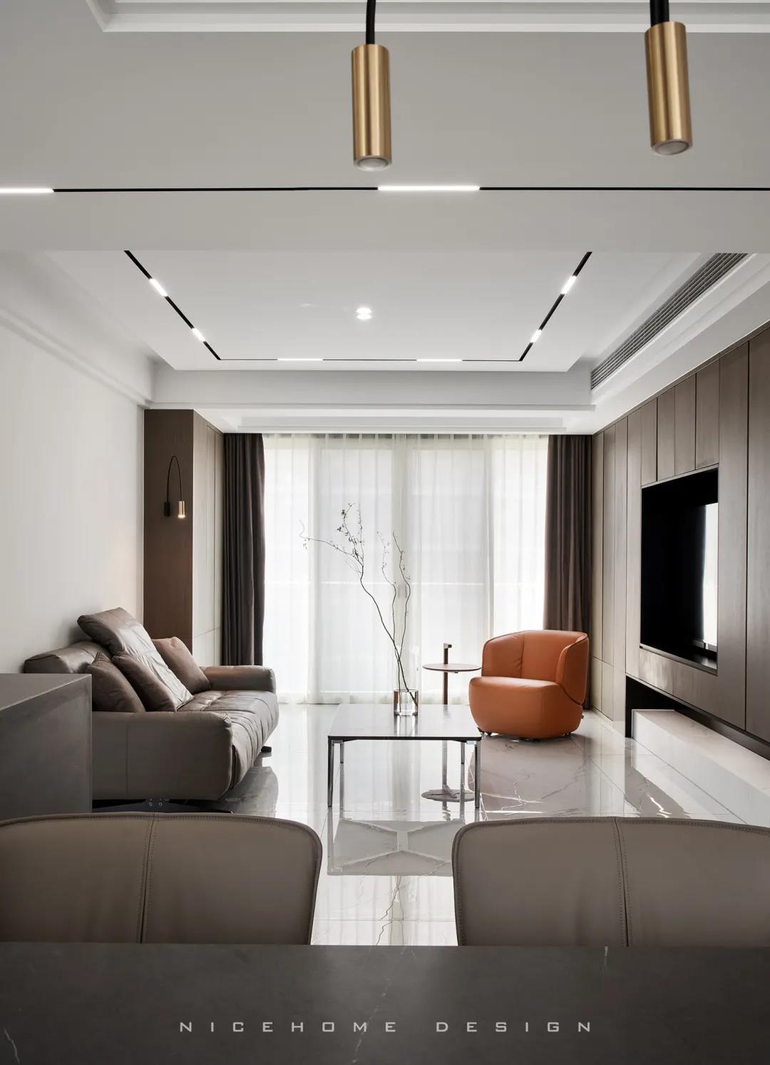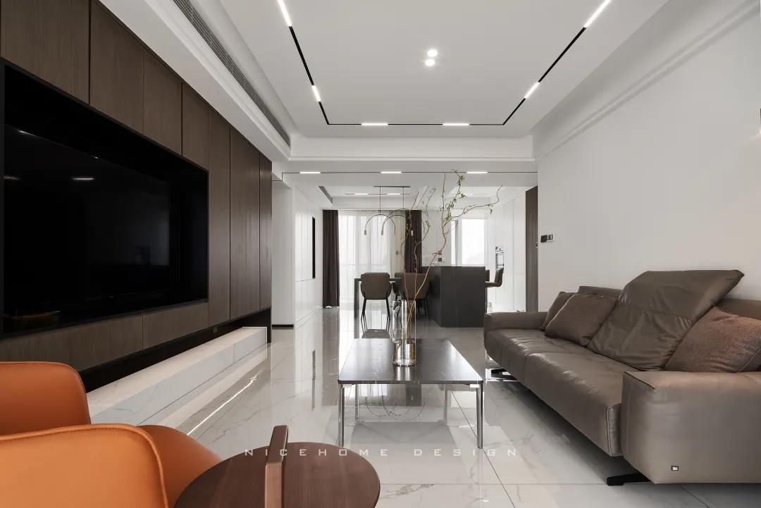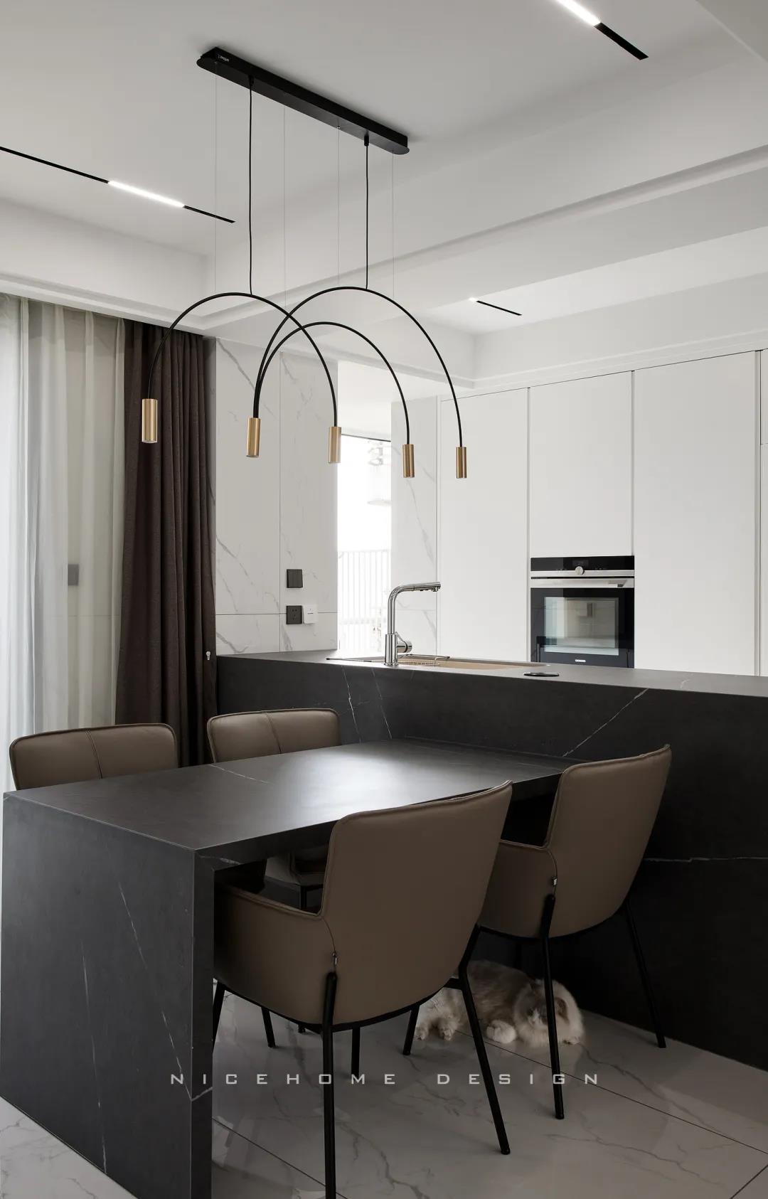 Quiet Time 本案以現代簡約風格為主旨,潔凈的配色、高級感的家具材質,以及巧妙的空間序列規劃,再加上通透寬敞的開放式布局,令整體空間在理性的架構中傳達著現代主義的美學觀感。 ? 案例信息 地址:天鴻君邑 戶型:兩室兩廳 面積:145㎡ 風格:現代簡約 設計施工:浙江南鴻裝飾 ? 戶型分析 屋子是超高層建筑,一方面承重結構比較多,能動的墻體有限,另一方面采光通風非常好。 主要是把原來的入戶花園改為了廚房,這樣原來的廚房就可以作為西廚和餐廳的一部分,解決了功能上的需求也讓餐廚區更寬敞。 走廊型玄關,與內里的過道無縫銜接,加上燈線的拉伸,視覺延展性極強。左手墻面留白,右手邊做深木色的收納柜提供合適的收納空間。 空間遵循現代簡約的架構模式,主色調由明凈的白和溫潤的木組成,淡然含蓄,幾根萌發綠意的小枝椏點綴出自然空靈的氣息。 電視背景墻做整面的柜體,地臺取代電視柜的位置,與上方柜體拉開一定距離,削減了一定厚重感。茶幾臺面選擇巖板材質,四四方方的造型含規整有序之意。 局部放置一把橙色單椅,讓視覺更富有生機,搭配置物小邊幾,閑暇時光的閱讀、喝茶也有了好去處。 屋子采光極好,開放式格局進一步放大優點,光線灑入空間,成為天然的柔光濾鏡。明朗有序的線條,搭建起主人向往的現代品質生活。 餐廚空間進行重新規劃后,餐廳與西廚合為一體,兩側白色高柜充分利用空間,把收納效率提到極致,極簡銑槽柜門無把手,讓視覺保持統一干凈。 一體成型的黑色巖板餐桌結合西廚島臺,塑造空間純粹內斂的高級質感,清冷有型之中悄然散發出精致韻味。 步入主臥,過道一側將衛生間干區與收納柜結合,類似酒店式的布局,干凈清爽。操作臺面周圍做擋水條,可以很好地防止濺水。 主臥內部利用陽臺拓展使用空間與視覺深度,同時讓更多的自然光線進入房間。背景墻留白,絳紫色絨布床頭詮釋著優雅,陽臺處擺放主人的健身器械方便早起運動。 衣庫位于主臥與次臥中間做統一收納,柜門使用長虹玻璃隔斷,結合柜內燈光所呈現的若隱若現的朦朧感,超絕!