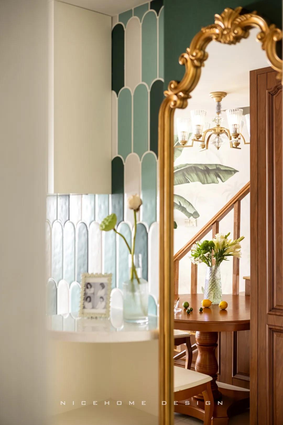 基于女主人的喜好,本案在空間中融入了大量復古元素,帶來賞心悅目的精致格調,清雅復古的綠與渾厚的棕色系家具碰撞,傳遞出無法抗拒的優雅與質感。