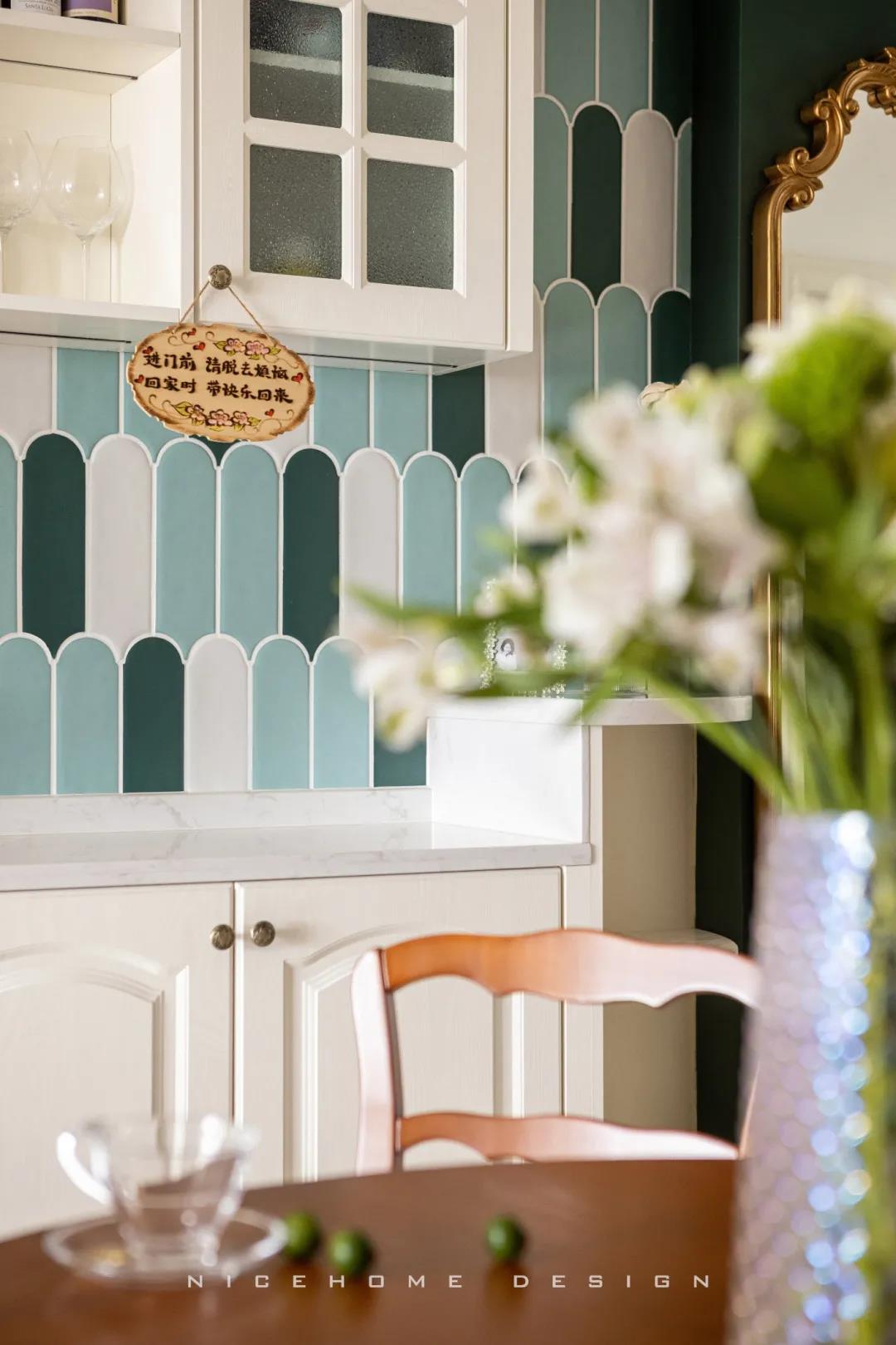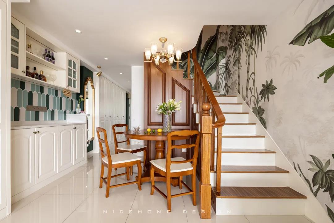 玄關3米長的鞋柜區延伸進來至樓梯下的餐廳空間,餐邊柜長約2米3,墻面鋪貼彩色孔雀羽瓷磚,清新又顯活力。棕櫚樹背景一路鋪展上樓梯,成為本案一大亮點。