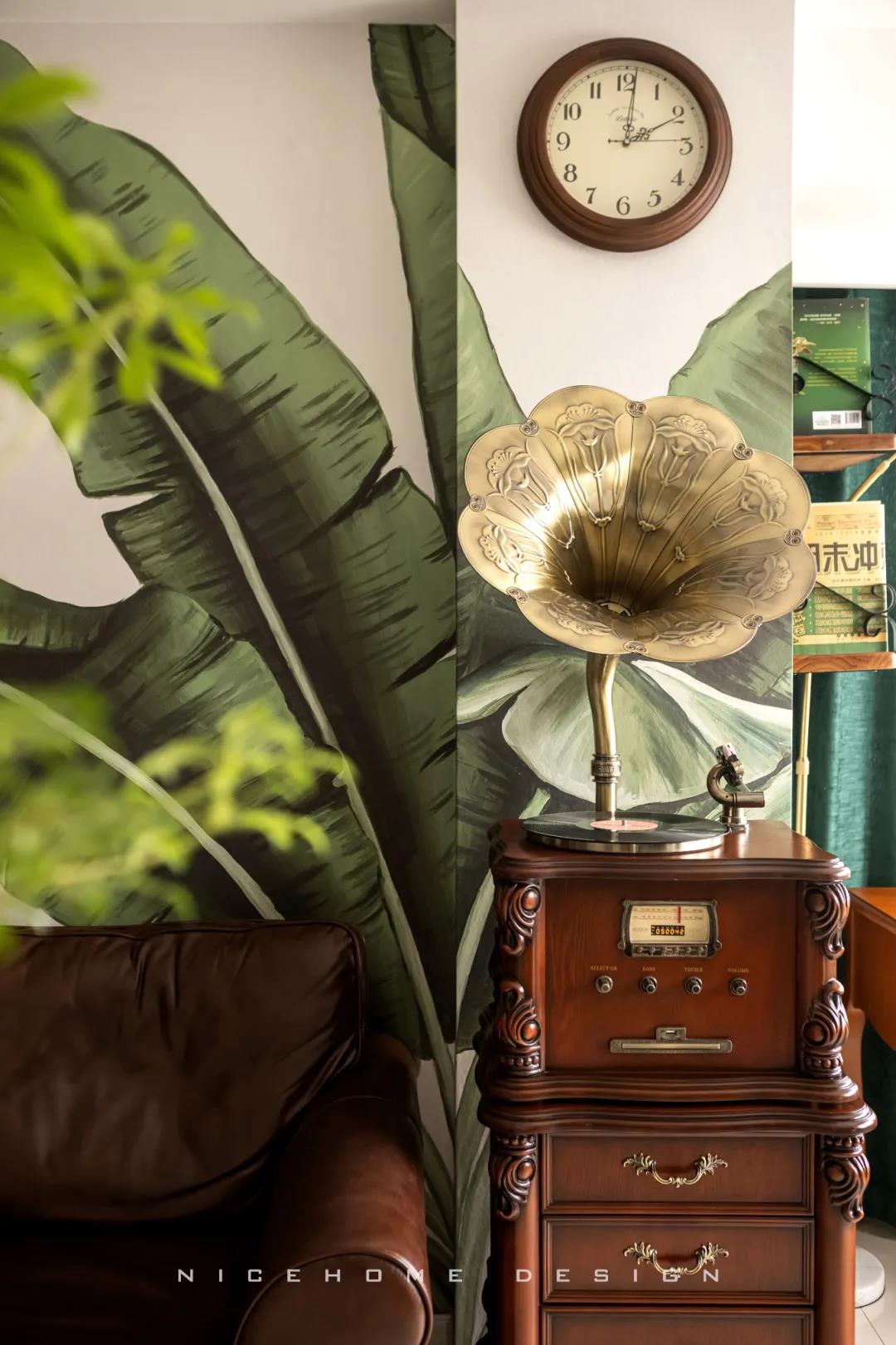 客廳,簡潔的陳設釋放出日常生活所需的空間感,復古綠的棕櫚樹定制墻畫和深棕色系家具形成強烈對比,消弭藝術與生活的邊界,墻角的留聲機成為點睛之筆。