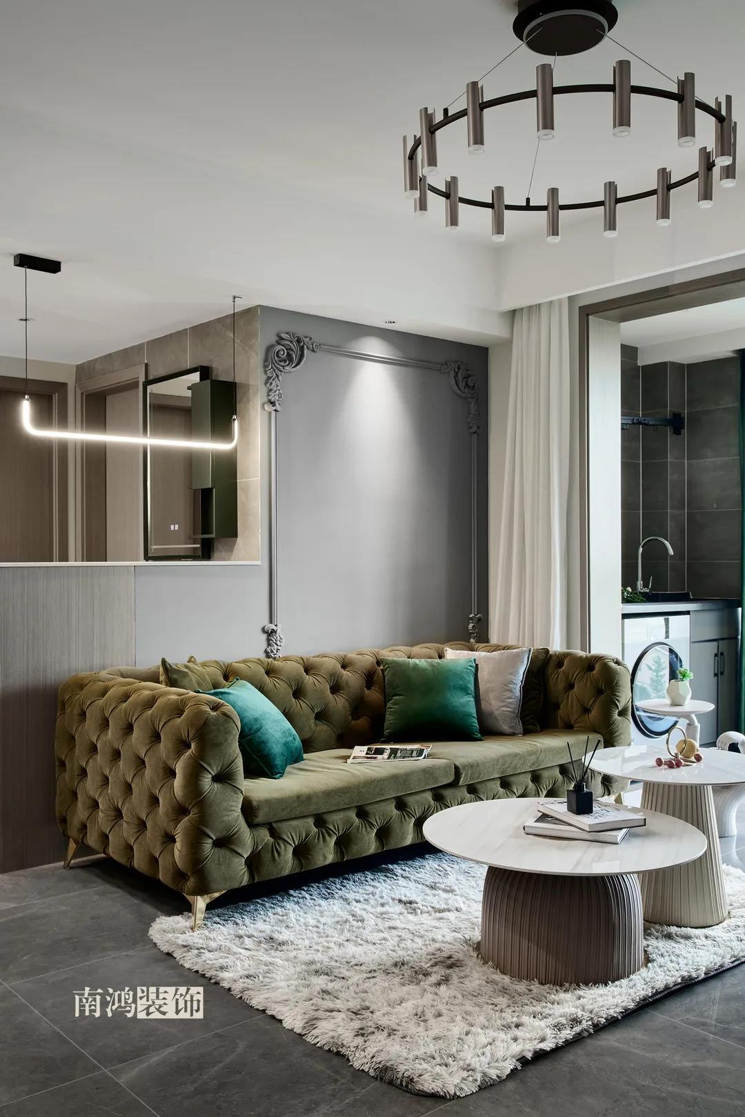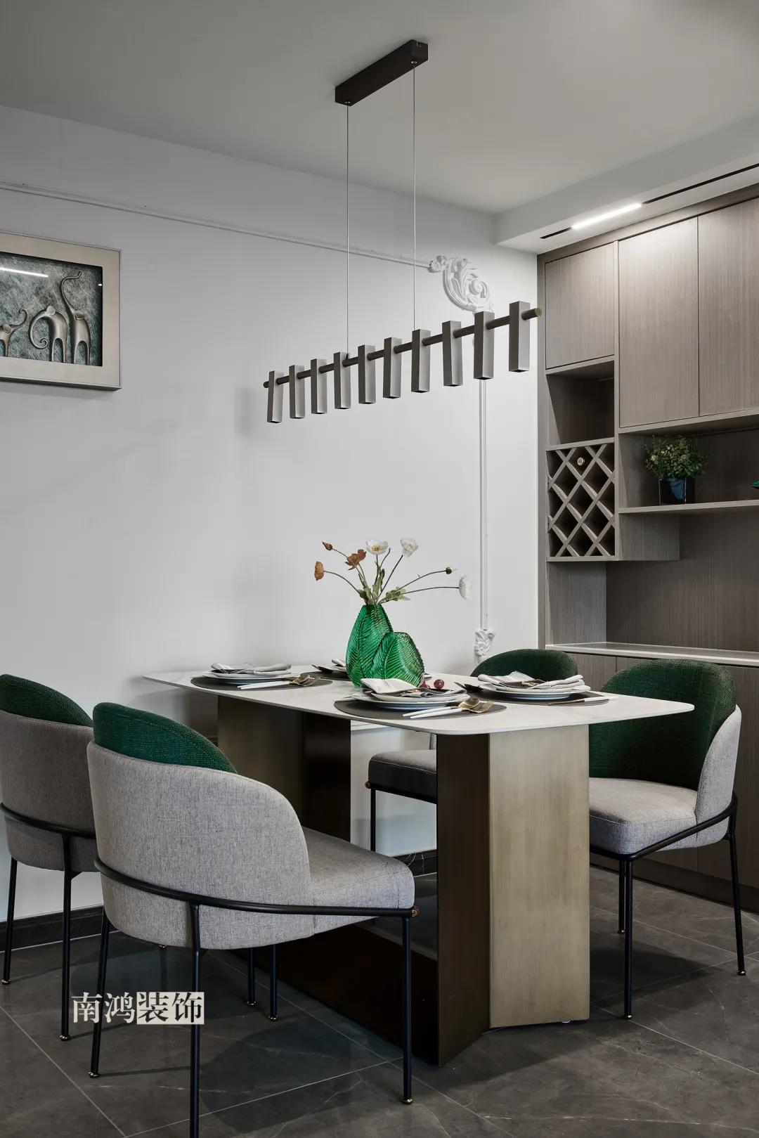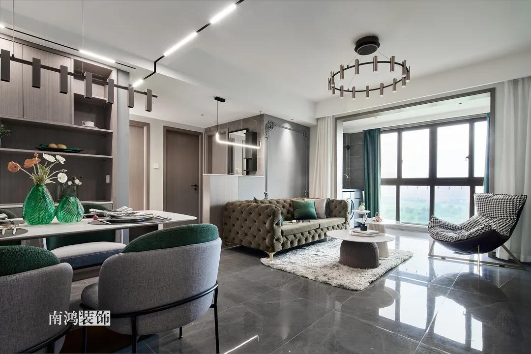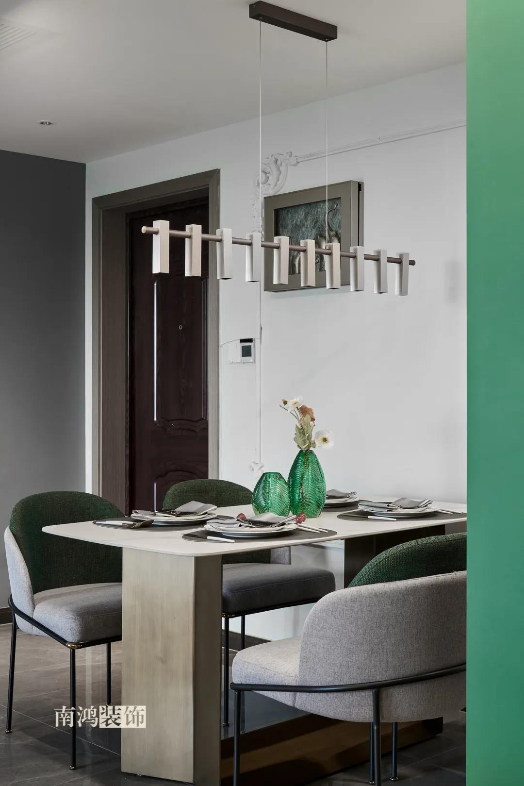 【項目·信息】 地址 / 世貿西西湖 戶型 / 三室兩廳 面積 / 91㎡ 風格 / 現代法式 設計施工 / 浙江南鴻裝飾 本案為91㎡現代法式風格作品。現代法式摒棄傳統法式繁復、冗雜的裝飾造型與甜膩的色澤,通過淡雅的色調,簡潔的幾何線條和典雅時尚的陳設軟裝,來打造更符合現代人喜好的生活空間。 業主夫妻倆,一位是性格沉悶的工程男,一位是熱情開朗的設計女,彼此志趣相投,性格互補,優雅的法式,給這個甜蜜小家庭增添了更多美妙情趣~ ▲原始結構圖 ▲平面設計圖 ①衛生間做干濕分離。 ②兒童房的門洞方向更改,完整電視背景墻效果。 ③主臥和次臥交換位置,次臥陽臺打通。 ④縮小主衛面積,墻體后退得以嵌入一個大衣柜。 入戶門進來即見餐廳。戶型面積不大,公區域都盡量打開讓視野更開闊。 硬裝整體簡潔,墻面可見石膏線花紋裝飾,借此強化一定法式空間意象。餐桌椅、吊燈的造型選擇也都偏現代,空間中奢與簡的分寸把握得恰到好處。 綠色作為本案的點綴色,可以說貫穿了幾乎各個分區之中,鮮活的生命力讓人過目難忘。 客餐廳一體式設計是小戶型的常見選擇,也更符合現代人的生活習慣。灰白主色保持整體低調,局部墻面以飽和度高的綠色乳膠漆涂刷,空間被提亮不少。 客廳采光良好,沙發背景墻連接干區的位置做一個小的半高柜,提升空間利用率。軟裝家具布置則用簡潔的設計手法將法式的古典優雅和現代的簡約時尚相結合,使得空間既有休閑感受,又不乏藝術氣息。 經過設計調整,電視背景墻的效果更加完整,深淺色調做左右兩塊分界,以石膏線裝飾則更顯精致。 拱形門洞也被應用在這里,作為歷史悠遠的一種經典建筑元素,本身就很契合各種帶古典意味的家居風格。 廚房以長虹玻璃門隔絕油煙,保證內部的私密性,也實現了采光的通透感。冰箱被移至過道,釋放內部更多空間。 廚房采用U型布局,動線流暢,烹飪區、操作臺和洗滌區都有各自獨立的空間,互不打擾。 主臥,青草綠墻布做背景裝飾,留白保持簡約調性,一幅婚紗照訴說著夫妻二人簡簡單單、明明白白的甜蜜愛情故事。 光源除主燈外,床頭兩側各有布置,一邊長臂燈一邊吊燈的不對稱設計,讓臥室空間顯得更加有趣,金屬材質呈現輕奢美感。 長輩房的背景、色彩選擇需要貼合老人的喜好,選用橙色主色,帶來如陽光般的燦爛、溫暖感受。 夫妻二人目前還沒有孩子,這個房間預備做以后的兒童房,布置相對簡單,方便將來調整。 衛生間將干濕區域分離,洗漱臺盆柜、壁柜與旁邊打造出的半高柜體可將瓶瓶罐罐都收入其中,保證視覺上的清爽。